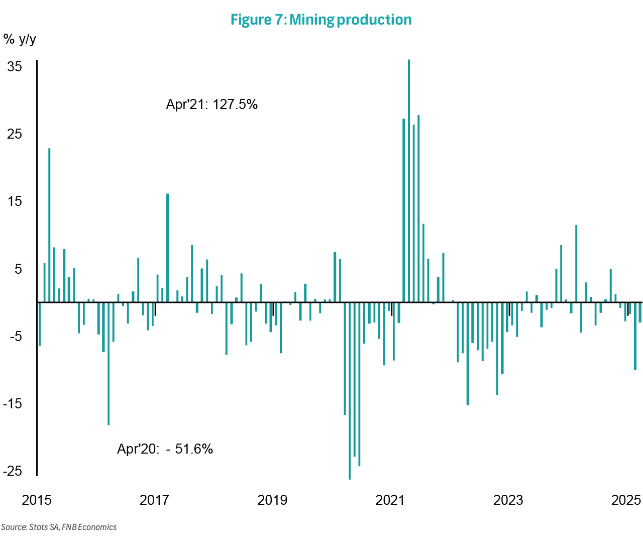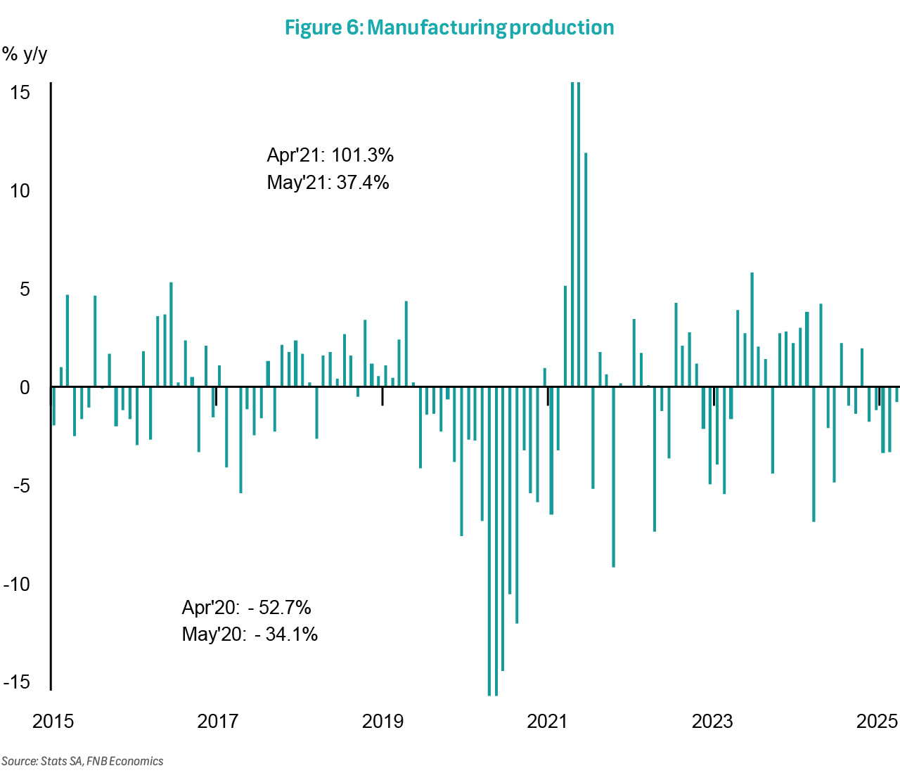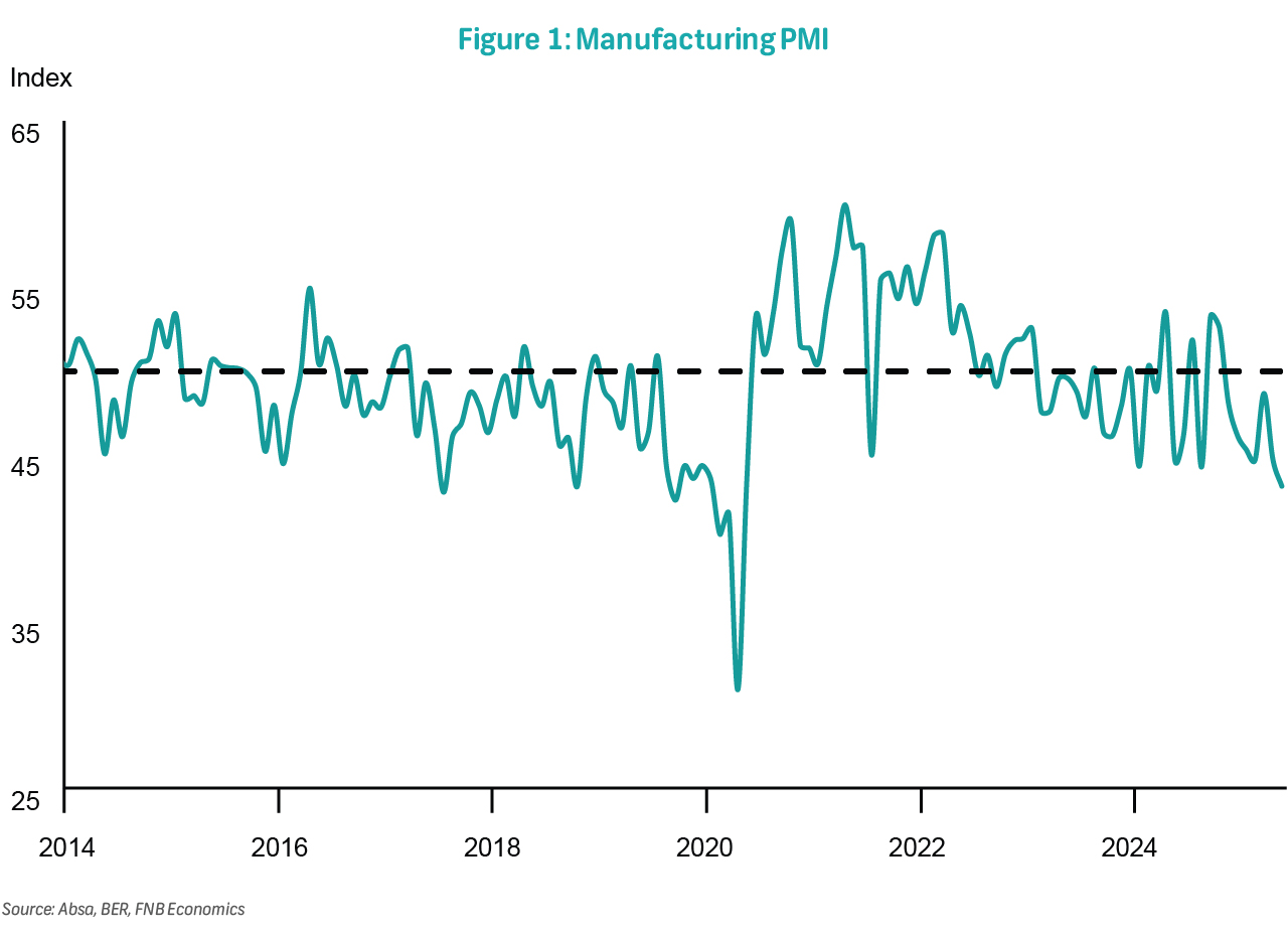 The seasonally adjusted manufacturing PMI fell further to 43.1 index points in May, from 44.7 points in April, marking the seventh consecutive month of contraction. While there was some improvement in business activity and new sales order ratings, both remained in negative territory at 43.4 and 38.3 points, respectively. Supplier delivery times declined from 56.6 to 49 points and respondents suggest that this is due to weak demand rather than improving logistical constraints. Fortunately, the index for expected business conditions in the near term increased by 13.9 points to 62.5, highlighting a lift in sentiment as external tariffs have been reduced and local policy uncertainty has abated.