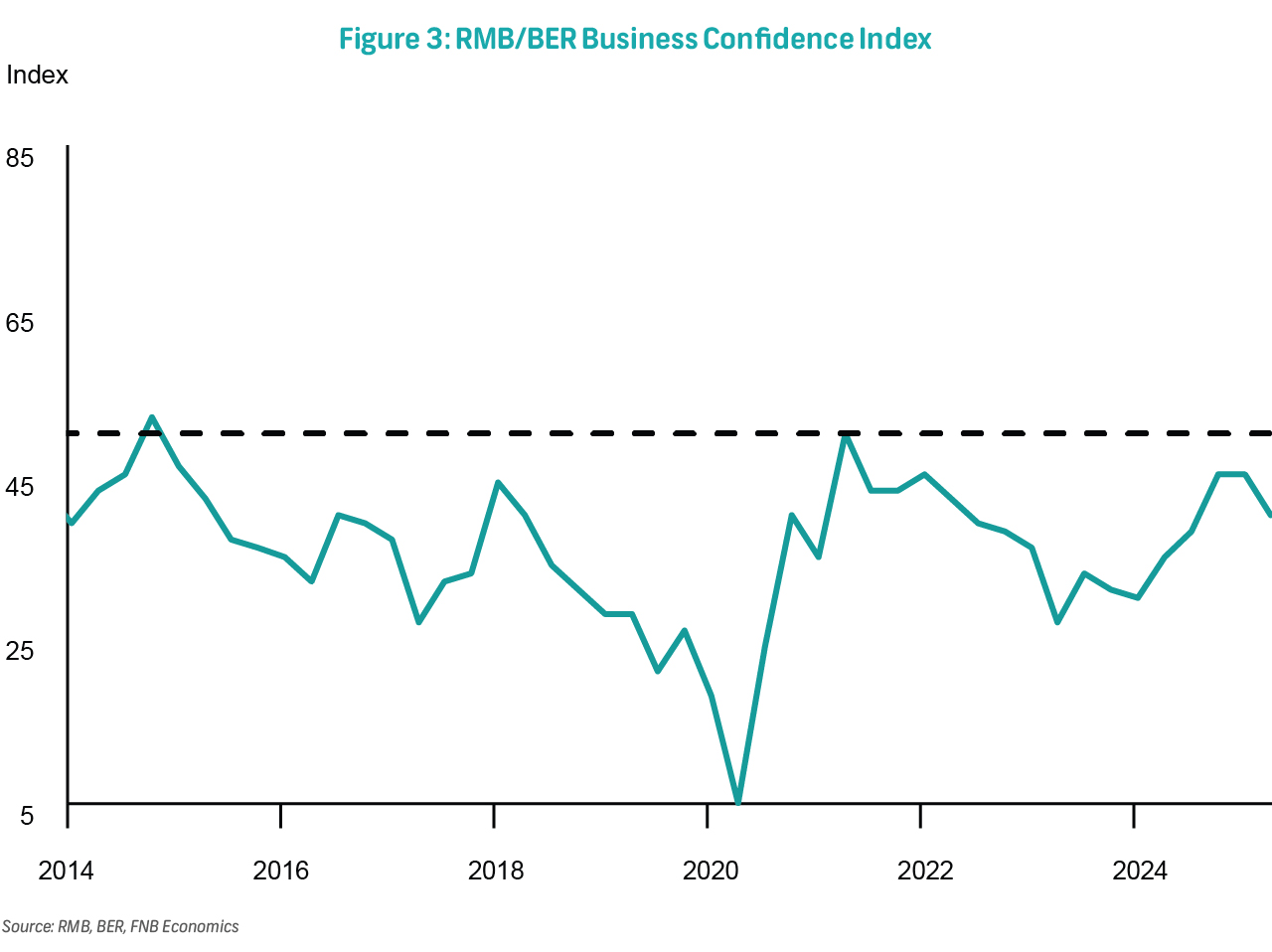 The RMB/BER Business Confidence Index (BCI) declined by five points to 40 in 2Q25, signalling a pause in business sentiment recovery that began in 2Q24. Despite remaining above the 2023-2024 average, confidence dipped slightly below the long-term norm, driven by declines in four of the five sectors, partially offset by a sharp increase in wholesale trade confidence. The survey, conducted from 7 - 26 May, was shaped by several external and domestic factors, including ongoing diplomatic tensions between the United States (US) and South Africa, global trade uncertainty, and persistent local logistical challenges. While equity markets showed some recovery following a pause in US trade tariffs, the rand experienced notable volatility. Locally, businesses were aware that a proposed VAT hike had been scrapped, though many responded before the release of Budget 3.0. Political uncertainty surrounding the GNU also influenced sentiment, though concerns about its stability eased somewhat during May.
