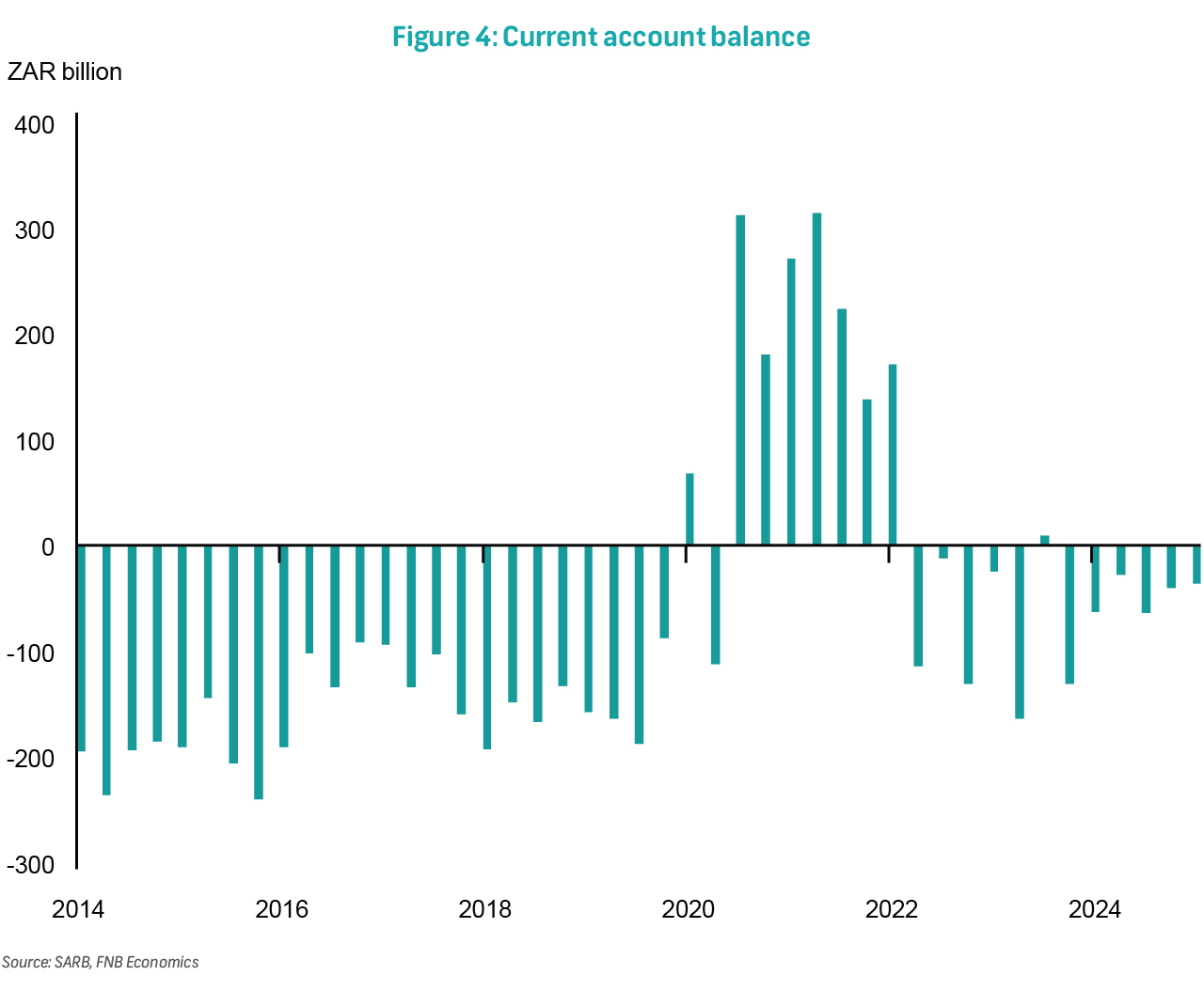 The current account deficit narrowed further to R35.6 billion in 1Q25 from R39.3 billion (revised from 31.6 billion) in 4Q24. As a percentage of GDP, the current account deficit was unchanged at 0.5% (4Q24 was revised down from 0.4%). The narrowing of the deficit was supported by the services, income, and transfer (SIT) account, which recorded a narrower deficit of R256.8 billion (3.5% of GDP) versus R265.7 billion (3.6%) in 4Q24. Meanwhile, the trade surplus narrowed to R221.2 billion (3.0% of GDP) from R226.4 billion - as the value of imports increased faster than that of exports. The strength in gold prices and other safe-haven commodities, versus softer oil prices, should continue to support SA's terms of trade, which increased in 1Q25. Over the medium term, the unwinding of logistical constraints and stronger trade relations will be important in insulating SA's external position.