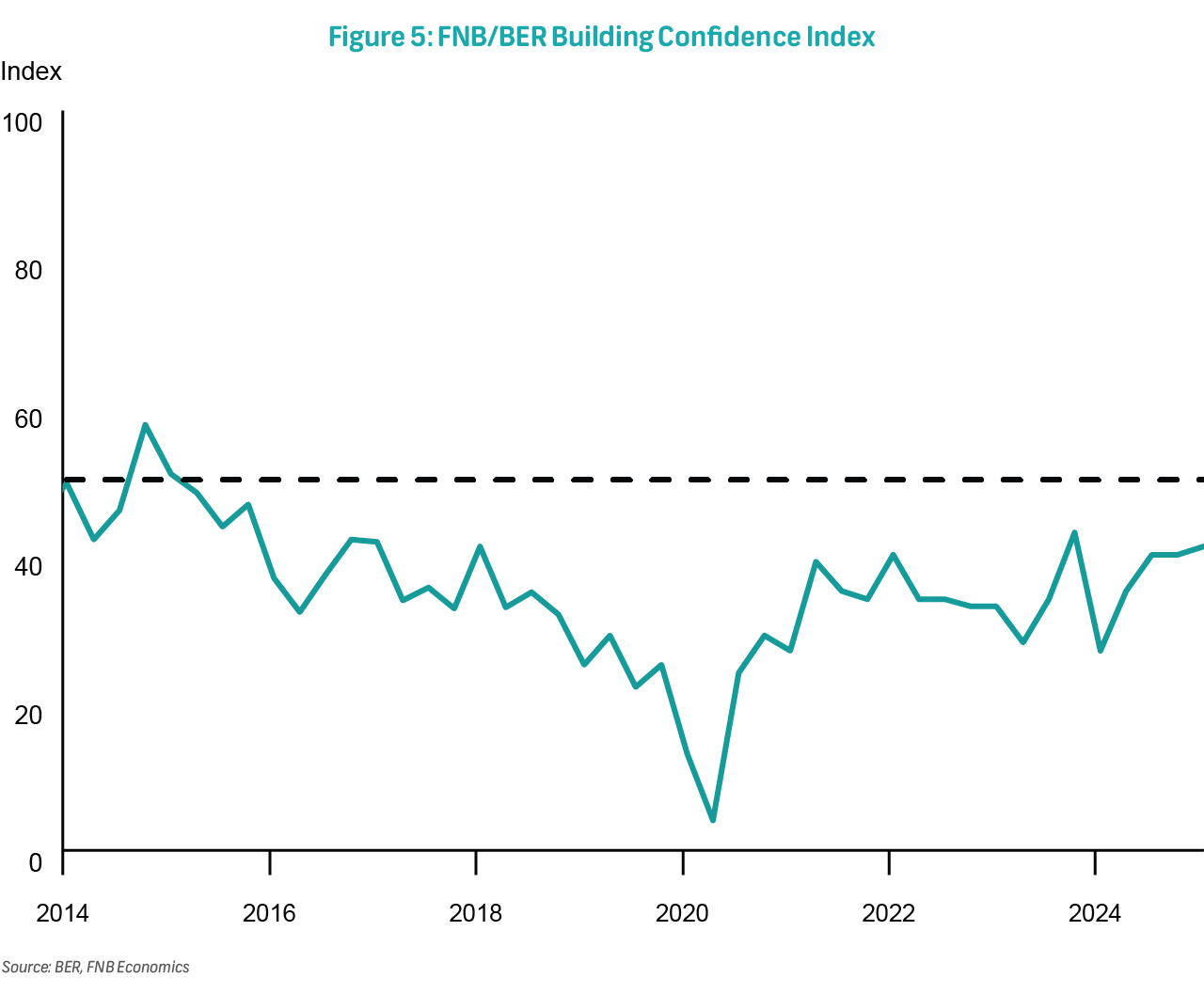 On Monday, the FNB/BER Building Confidence Index for 2Q25 will be published. The index registered a marginal increase to 41 points in 1Q25 from 40 points previously, reflecting largely stable but persistently subdued sentiment within the building sector. Subsector performance was mixed: hardware retailers, quantity surveyors, and building subcontractors reported higher confidence in the first quarter, while main contractors, architects, and building material manufacturers experienced declines. Despite a contraction in main contractor activity, optimism regarding near-term prospects remained, corroborated by increased architect activity, which is indicative of potential future demand. However, concerns regarding municipal inefficiencies and the potential for unfulfilled expectations pose risks to the near-term outlook.