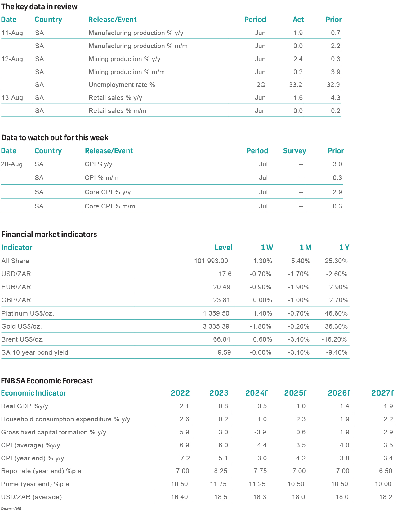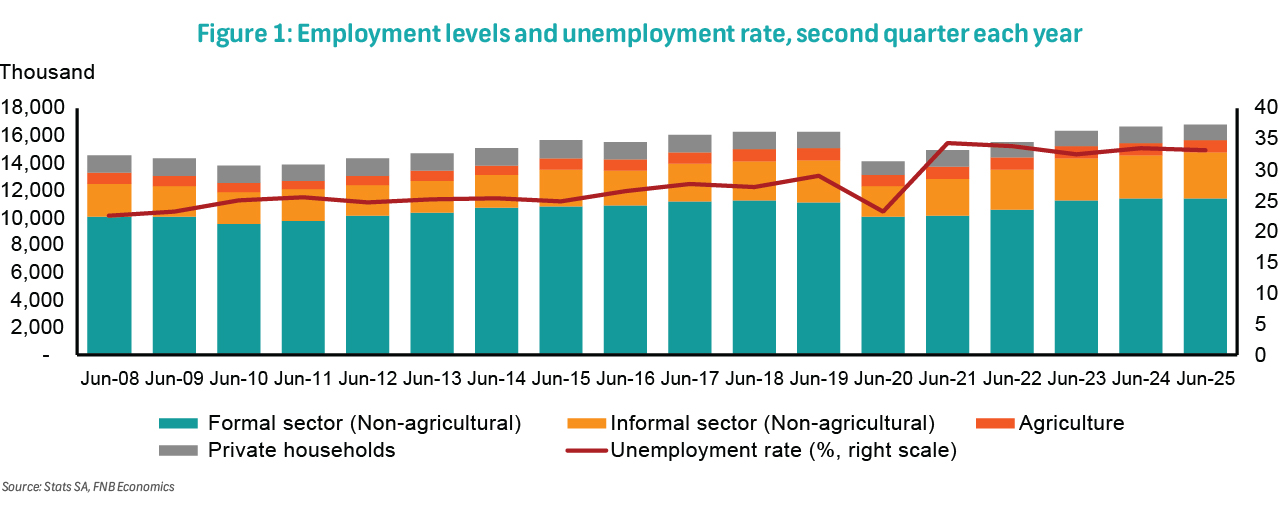 This week, Stats SA released the Quarterly Labour Force Survey (QLFS) results for 2Q25, a household-based survey that tracks employment trends. The data showed that the economy added 19,236 jobs compared to the previous quarter, bringing total employment (formal, informal, agriculture and private households) to 16,806,502, which is 154,169 higher than a year ago (Figure 1). However, the official unemployment rate rose to 33.2% from 32.9% in 1Q25, as the number of unemployed increased by 139,751 to 8,367,429 individuals. Combined with the ongoing moderation in the absorption rate, this underscores persistent vulnerabilities in the labour market and the economy's limited capacity to generate much-needed jobs.