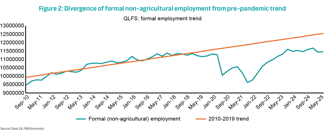 Over the longer term, the economy has managed to recover the 2,272,053 jobs lost in the first half of the pandemic year (2020) and the 659,566 jobs lost in 3Q21 after the July 2021 social unrest. Yet, as Figure 2 illustrates, formal non-agricultural employment has diverged from its pre-pandemic trajectory - a sign of the economy's weakened structural health and diminished ability to achieve the job creation ambitions of the National Development Plan (NDP). The decline in formal employment has been particularly pronounced in the productive sectors such as manufacturing, mining, and construction, mirroring their long-term decline in real GDP contribution. Mining's share has fallen from 10.0% in 1993 to 4.4% in 2024; manufacturing from a peak of 14.9% in 1995 to 11.2% last year; and construction from 3.6% in 2009 (just before the 2010 FIFA World Cup) to 2.2% in 2024.