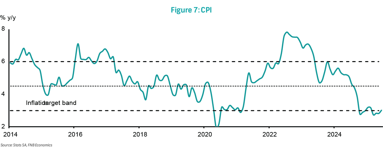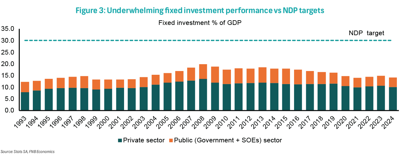 Similarly, real fixed capital stock, the value of physical assets used in production, in the manufacturing sector has declined steadily since peaking in 2008, alongside a gradual erosion of formal worker productivity. At the same time, both private and public sector fixed investment (gross fixed capital formation) have fallen short of NDP targets (Figure 3), reflecting weak demand, broader structural bottlenecks, depressed business confidence and limited fiscal space to support public sector infrastructure investment. While initiatives such as Operation Vulindlela aim to address these challenges, progress needs to be swift and decisive, particularly as South Africa also faces potential job losses from United States (US) tariff measures.