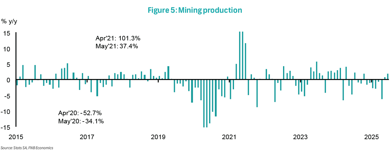 Mining production (not seasonally adjusted) expanded by 2.4% y/y in June after expanding by a modest 0.3% in May. The outcome exceeded Bloomberg consensus expectations of 1.4%. Seasonally adjusted mining output, which feeds into the official calculation of quarterly GDP growth, grew by 0.2% in June, after a revised 3.9% increase (previously 3.7%) in May. As a result, mining output expanded by 3.9% q/q in 2Q25, partly recovering from the 4.1% contraction in 1Q25 and confirming the sector's positive contribution to 2Q25 GDP growth.