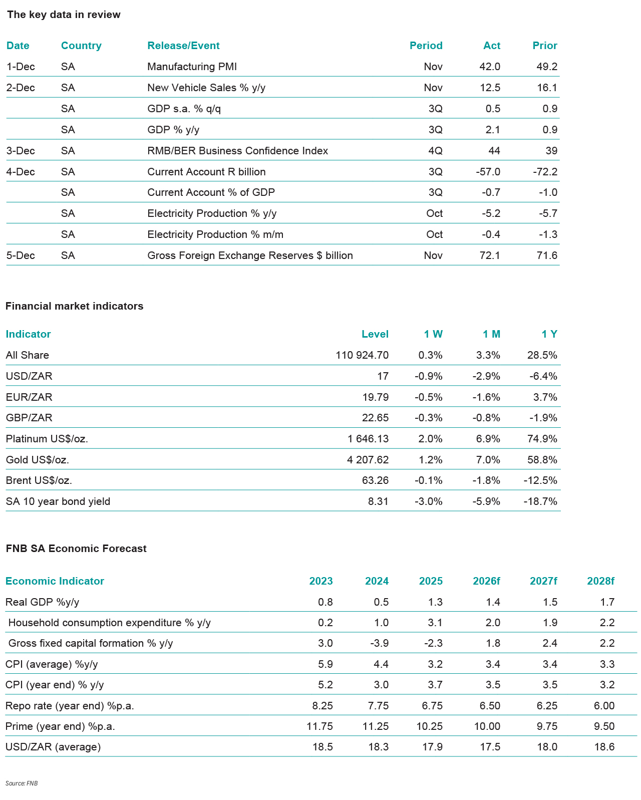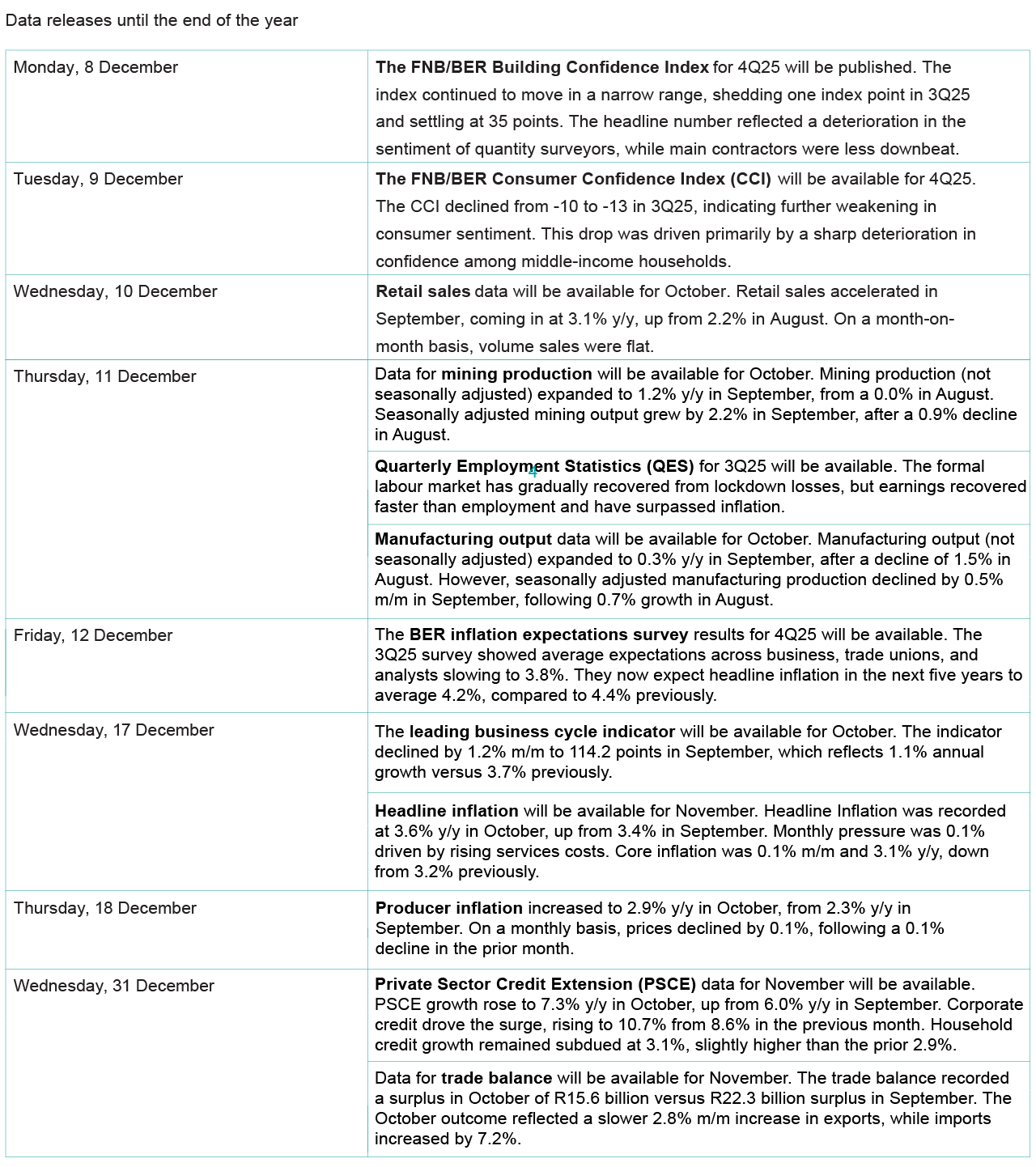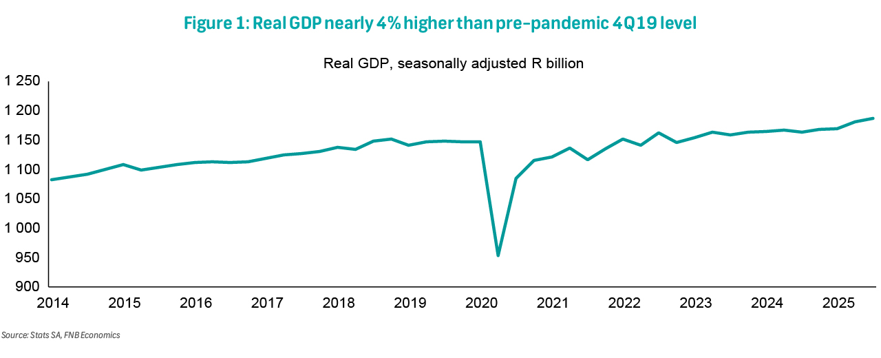 The latest release of 3Q25 GDP data reflected continued economic momentum, with seasonally-adjusted quarterly growth of 0.5%, moderating from 0.9% in 2Q25. This marked a fourth consecutive quarter of expansion, supported by growth in nine out of ten industries. On an annual basis, real GDP (non-seasonally adjusted) rose by a solid 2.1% compared with the corresponding quarter last year, marking eight consecutive quarters of annual growth and reinforcing evidence of an emerging upturn in South Africa's economy, despite persistent global headwinds. Excluding the notoriously volatile agriculture, forestry and fishing sector, GDP was 1.1% higher than a year ago and 2.1% above the same quarter in 2023, signalling a firmer underlying recovery. We have accordingly marked our macroeconomic projections to market, as discussed overleaf.