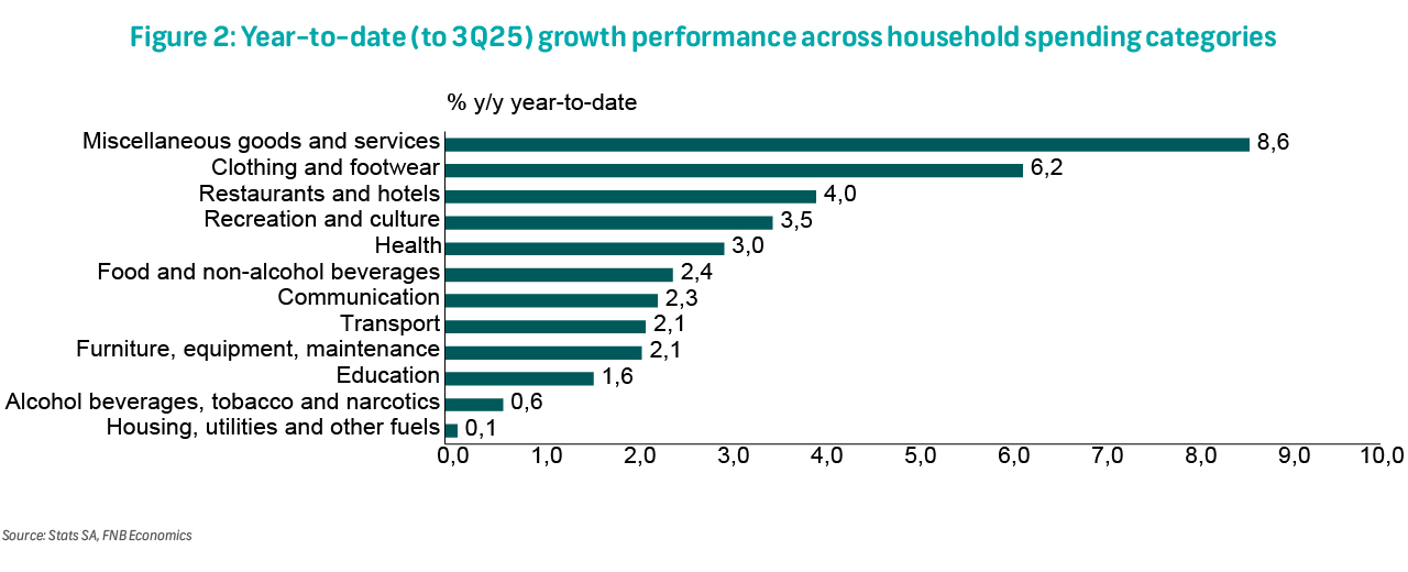 Expenditure on food and non-alcoholic beverages increased by 2.4%, communication by 2.3%, transport equipment by 2.1%, furniture and household equipment by 2.1%, and education by 1.6%. Spending on alcoholic beverages, tobacco and narcotics rose modestly by 0.6%, while utilities expenditure was broadly flat at around 0.1% year-to-date.