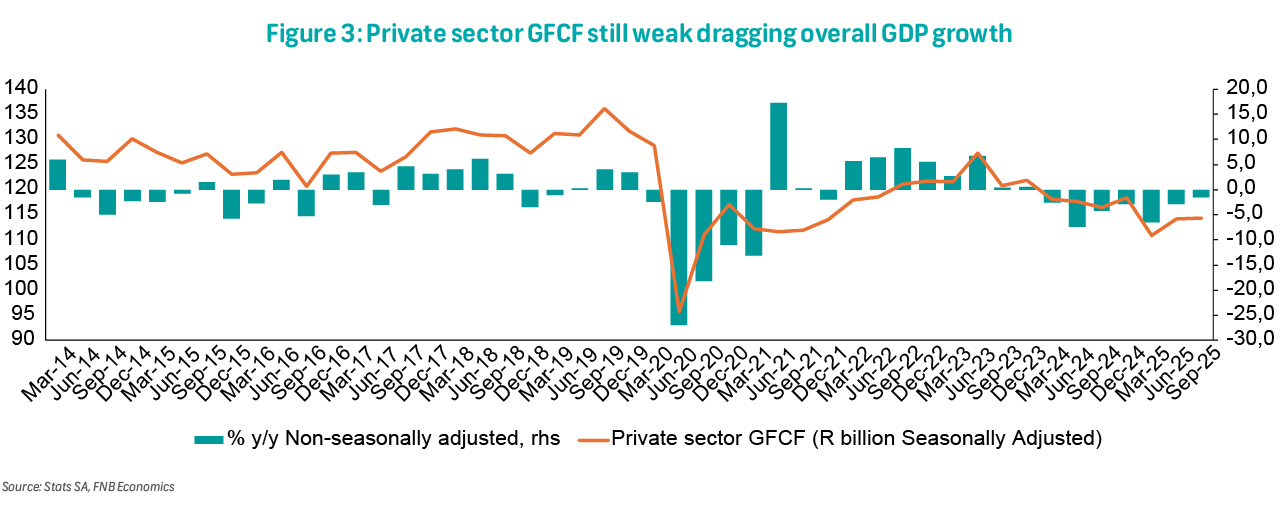 In contrast, total gross fixed capital formation (GFCF) increased by 1.6% q/q in 3Q25, rebounding from a 1.6% contraction in 2Q25, but annual trends continue to show weakness. GFCF fell by 1.9% compared with the same quarter last year, and by 4.7% relative to 3Q23. Over the first nine months of this year, GFCF declined by 2.7% compared with the same period in 2024, largely due to a 3.6% fall in private sector investment amid subdued confidence, weak domestic and external demand, and ongoing global trade uncertainty.