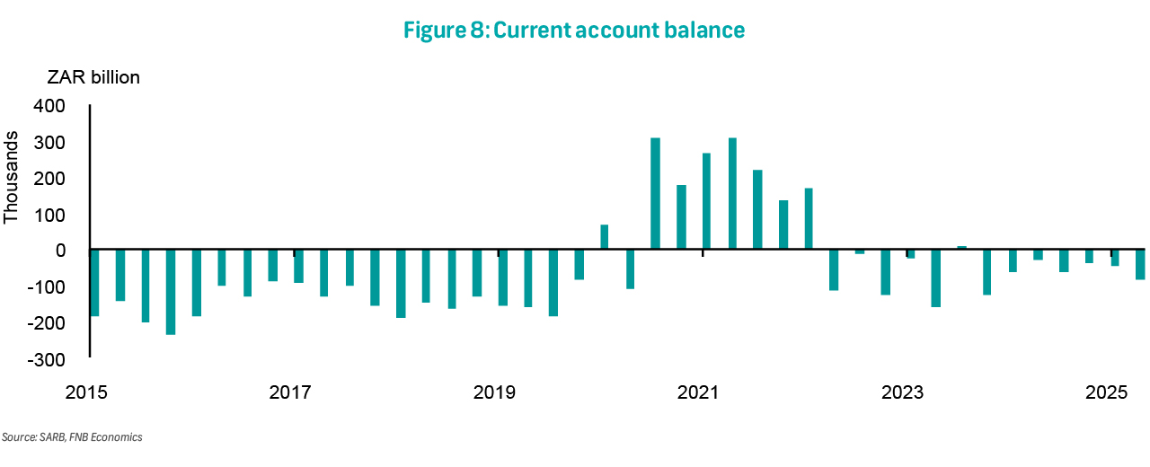 The current account deficit narrowed to R57.0 billion in 3Q25, from a downwardly revised deficit of R72.2 billion in 2Q25. As a percentage of GDP, the current account was -0.7% versus -1.0% in the previous quarter. This reflected a narrower deficit on the services, income and current transfers account, which decreased from R259.4 billion to R235.3 billion, mainly due to a smaller shortfall on the primary income account. The trade surplus on goods and services narrowed, from R187.2 billion in 2Q25 to R178.3 billion in 3Q25, as total export volumes fell while import gains were driven by the price effect. In line with this, SA's terms of trade deteriorated as total import prices outpaced those of exports. The trade surplus on goods and services was 1.4% of GDP versus 1.7% previously.