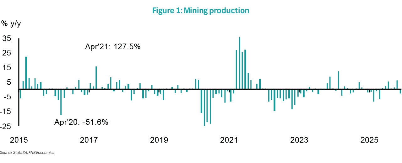 Mining production (not seasonally adjusted) contracted by 2.7% y/y in November, down from an upwardly revised 6.1% (previously 5.8%) in October. Seasonally adjusted mining output fell sharply by -5.9% m/m, down from 2.7% (previously 2.1%) the month before. The largest negative contributors were coal, iron ore, PGMs and gold, while Manganese ore was the largest positive contributor coming in at 17.0%. As a result, output for the three months to November increased by 1.6%, slowing from 2.5% growth in the preceding three months to September 2025. This suggests that the mining sector's contribution to 4Q25 GDP growth may have weakened.