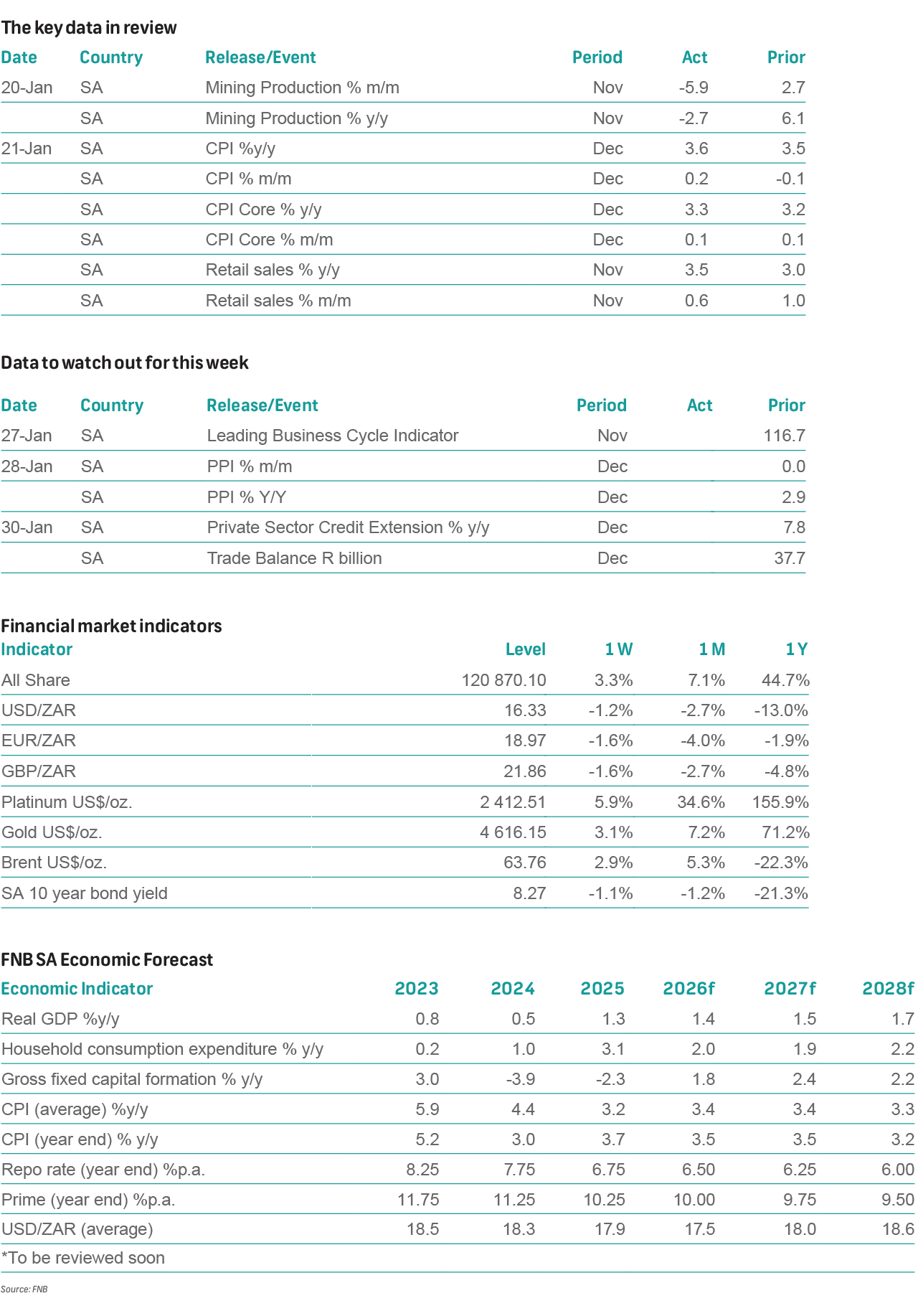 Also on Friday, the trade balance for December will be published. The trade balance recorded a surplus in November of R37.7 billion versus a R15 billion surplus in October. The November outcome reflected a softer 1.9% m/m fall in exports, while imports fell sharply, dropping 14.9% m/m to a five-month low of R150 billion.