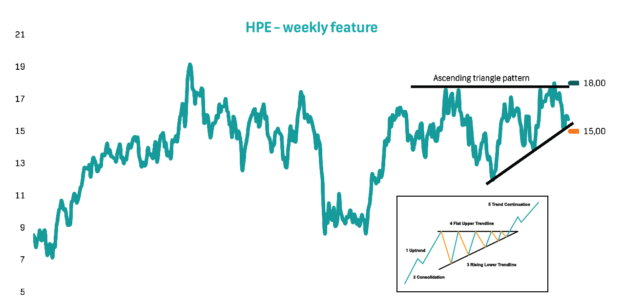 Technically, the price appears to be in an incomplete ascending triangle pattern (see the black converging trendlines on the main chart as well as the insert). The ascending triangle pattern shows that demand for the stock is outstripping available supply (indicated by higher lows).
