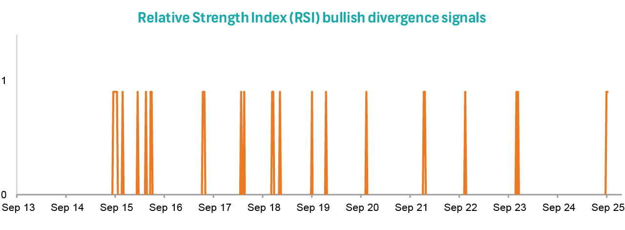 Fading downside momentum in the Moving Average Convergence Divergence (MACD) histogram and a stable on-balance volume (OBV) indicator trajectory both support a bullish outlook.